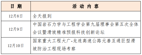 各位学会领导班子成员、各位理事,各分支机构、省级学会、团体会员单位,各有关单位和个人:为全面贯彻党的二十大精神,促进习近平新时代中国特色社会主义思想主题教育活动走深走实,推动我国岩石力学与工程事业高质量发展,进一步落实学会“十四五规划”,经研究决定,于2023年12月8~10日在广州市召开“中国岩石力学与工程学会第九届理事会第五次全体会议暨滑坡精准预报科技创新论坛”。现将会议事项通知如下:地点:广州富力空港假日酒店(地址:广东省广州市花都区花东镇金谷北路 11 号)主办单位:中国岩石力学与工程学会、中国灾害防御协会、广东省交通集团有限公司、广州交通投资集团有限公司、“科创中国”岩石力学与重大工程——国家重点实验室科技创新联合体承办单位:中国铁道科学研究院集团有限公司、中国岩石力学与工程学会滑坡与边坡分会、中国灾害防御协会交通分会、广东省南粤交通投资建设有限公司、广东华路交通科技有限公司、广东和立土木工程有限公司协办单位:广州大广高速公路有限公司、广东省南粤交通龙连高速公路管理处、中铁西北科学研究院有限公司、中铁十二局集团有限公司、广东省岩石力学与工程学会、中国岩石力学与工程学会红层分会、中国岩石力学与工程学会工程实例专委会、中山大学土木工程学院、《岩石力学与工程学报》编辑部