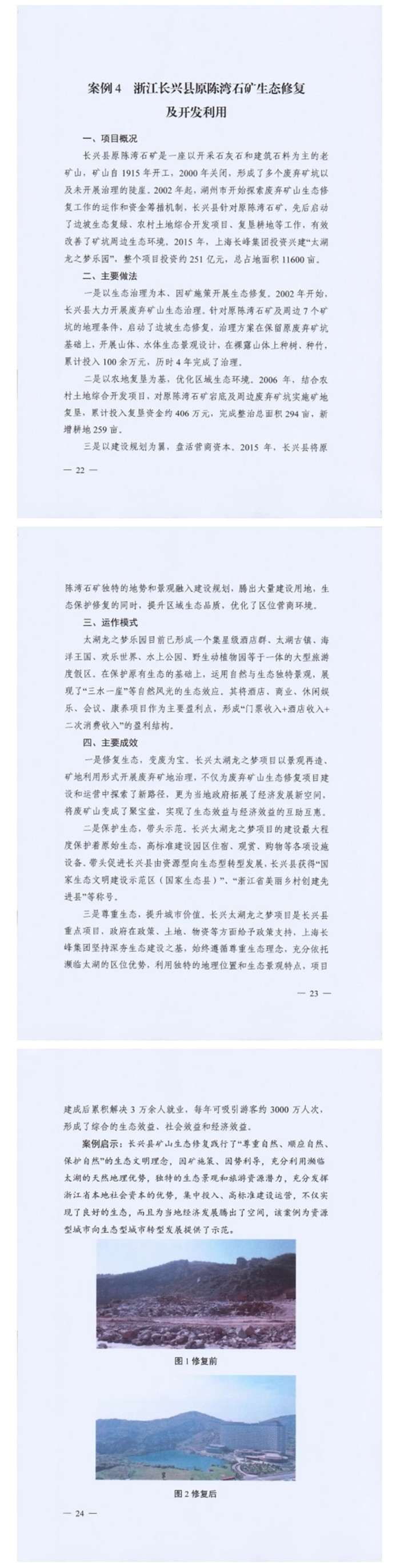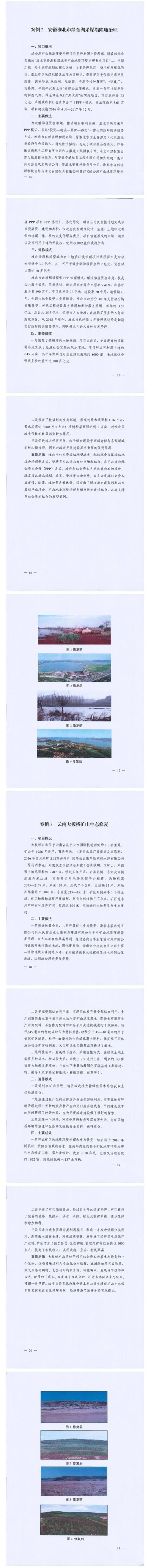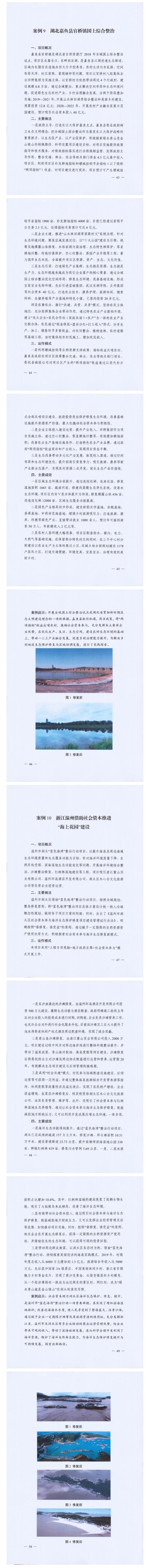 《案例》收集了社会资本参与矿山生态修复、山水林田湖草生态保护修复、土地综合整治和海洋生态保护修复四种类型共10个案例,重点介绍主要做法、运作模式和实际效果。10个案例中,包括以生态修复改善生态环境带动社会资本投资、政府和社会资本合作共建、生态修复与城市建设发展结合、生态修复与脱贫攻坚融合、生态修复带动旅游业发展等生态保护修复的模式,发挥了良好的生态效益、经济效益和社会效益。 |